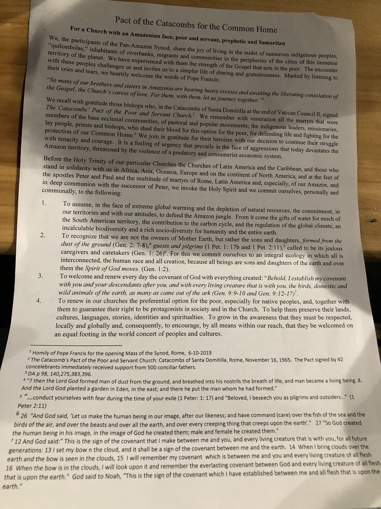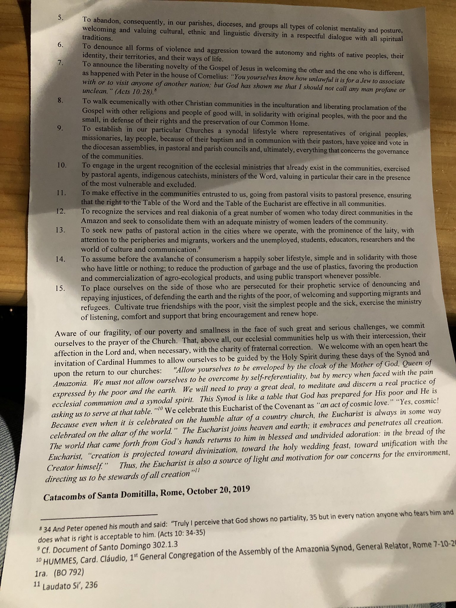 Dear brothers and sisters, together let us look to the crucified Jesus, to his heart pierced for our salvation. Let us begin there, the source of the gift that has given us birth. From that heart, the Spirit who renews has been poured forth (cf. Jn 19:30). Let each and every one of us, then, feel called to give life. So many of our brothers and sisters in Amazonia are bearing heavy crosses and awaiting the liberating consolation of the Gospel, the Church’s caress of love. So many of our brothers and sisters in Amazonia have given their lives. I would like to repeat here the words of our beloved Cardinal Hummes: when he arrives in those little towns of Amazonia, he goes to the cemetery to visit the tombs of missionaries. It is a gesture on the Church’s behalf for those who gave their lives in Amazonia. And then, with a little shrewdness, he says to the Pope: “May they not be forgotten. They deserved to be canonized”. For them and for all those who have given their lives and those who are still giving their lives, and with them, let us journey together.
